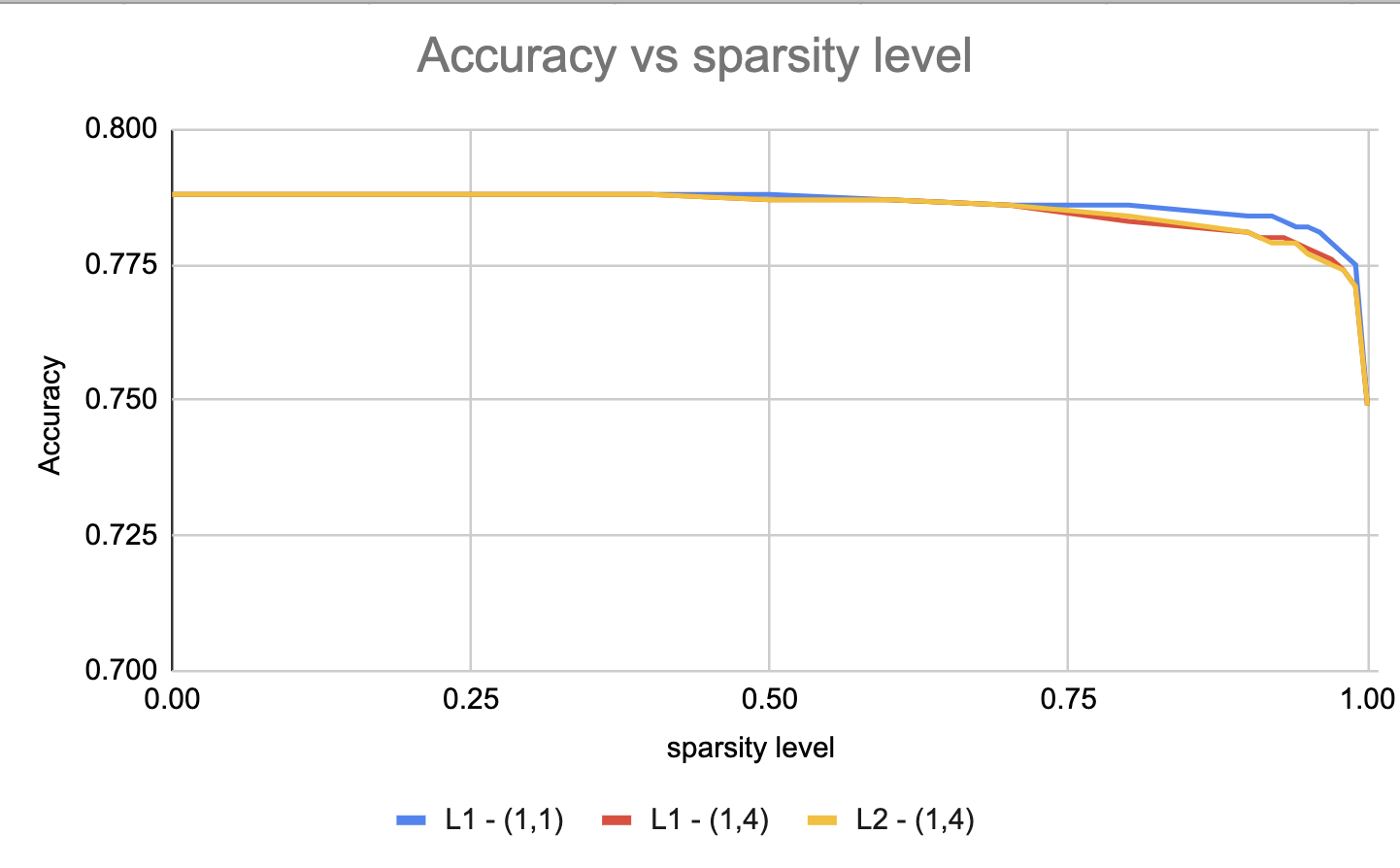 2. **Model Quality**: The model accuracy decreases slowly with sparsity levels. Even at 90% sparsity levels, the model accuracy decreases only by 2%.