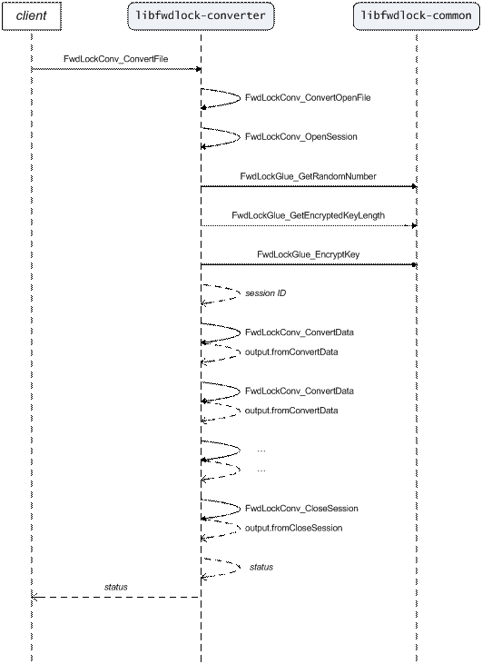 Internally, FwdLockFile_ConvertFile calls FwdLockFile_ConvertOpenFile. The latter then proceeds with the conversion using the push-mode API, acting as the client in the previous use case; see section 3.1.1.