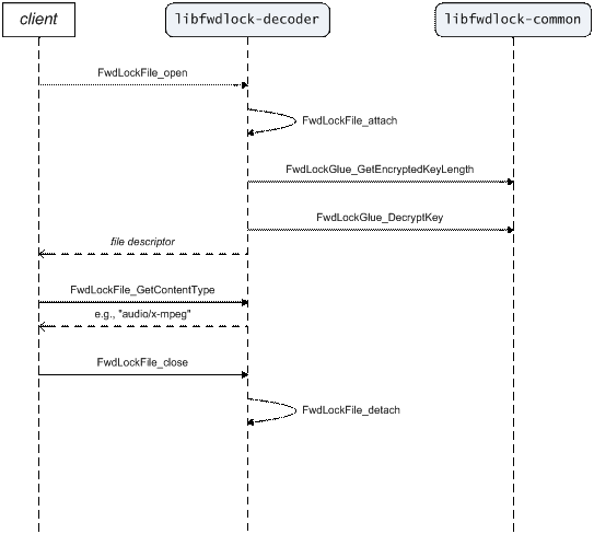 The Forward Lock Converter converts OMA DRM Message files to the internal file format. The Forward Lock Decoder provides a POSIX-level API for transparent reading and seeking through such a converted file as if it were unencrypted. The API also includes functions for checking a file’s integrity and getting the MIME type of its embedded content.