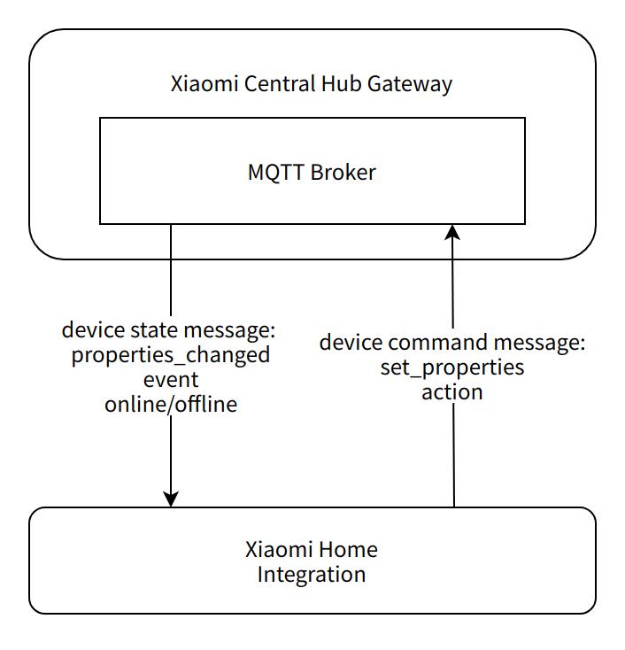 Xiaomi central hub gateway contains a standard MQTT Broker, which implements a complete subscribe-publish mechanism. Xiaomi Home Integration subscribes to the interested device messages through Xiaomi central hub gateway. When a device property changes or a device event occurs, the device sends an upstream message to Xiaomi central hub gateway, and the MQTT Broker pushes the subscribed device message to Xiaomi Home Integration.